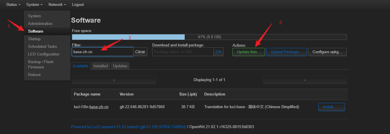 sed -i 's/downloads.openwrt.org/mirrors.ustc.edu.cn\/openwrt/g' /etc/opkg/distfeeds.conf && opkg update- 安装中文包